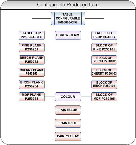 The following outlines the family items that need to be identified. A family item is an end item that you want to configure, i.e. items that are variations of a standard design; in this case a table. This table can consist of different types of wood, and can be painted in different colours and be of various lengths depending on the configuration.