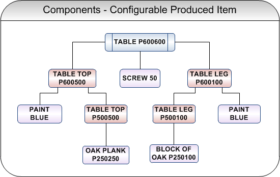 The following provides an example of how the tables would be set up for a sample configurable produced item; namely a Table. See Setup documents for Product Configurator for the main instructions of how to set up configurator tables for produced items as well as for order structure items).
