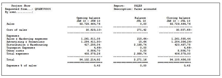 - Displays the total of sales, cost of sales and total expenses accounts. For more information about creating this line, see Define a sum line
